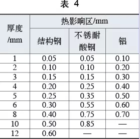 (6)热影响区小 激光切割过程中,被切割材料边缘由于受热会产生热影响区。但激光切割较其他加工方法能量集中热输入小,与精细等离子切割和火焰切割相比,热影响区相对较小,如表4所示。热输入小,对受热容易晶粒长大的铁素体不锈钢和容易有淬硬倾向的高强钢有很重要的意义,有利于提高焊缝质量。